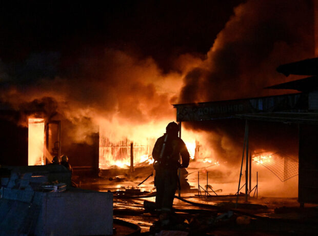 Hadisə şahidlərinin sözlərinə görə, yanğından əvvəl şəhərin üstündə partlayış səsləri eşidilib. İlkin məlumatlara görə, hava hücumundan müdafiə sistemi işə salınıb.